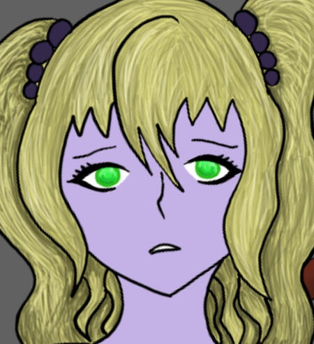 Mina is usually depicted as a pale purple, with bright green eyes that lack pupils. (Though that’s just stylized haha.) She has blonde hair in two ponytails. Childish? Maybe but other than that she has wavy hair. Sometimes her hair is dyed reddish-brown, especially while living with her daughter. She’s mostly in scrubs or a lab coat but has a few casual outfits.Personality/Attributes